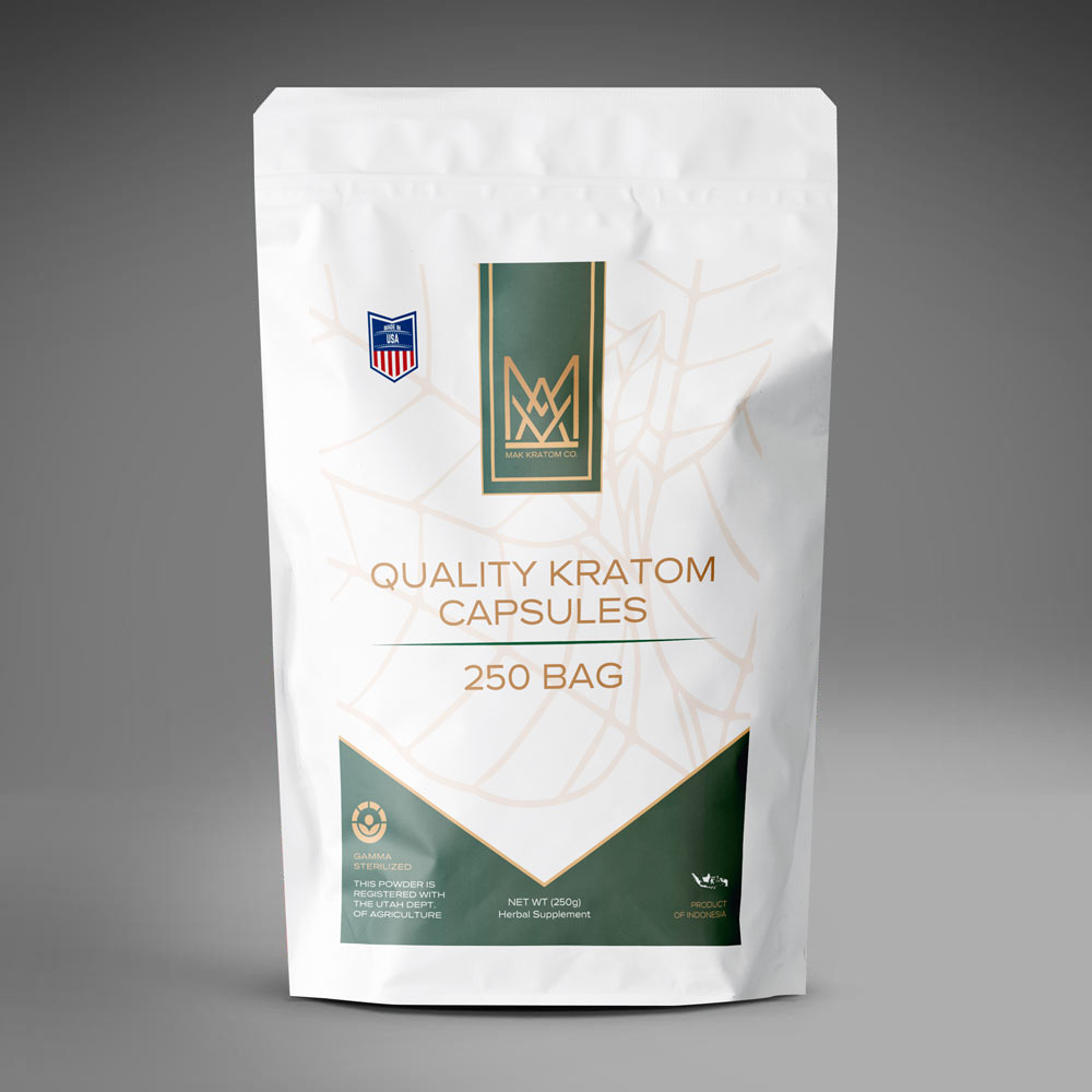 #MAK 250g Bag Kratom Capsules: LAB TESTED! Filled with ONLY pure Mitragyna Speciosa powder from our always tested batches. No binders, fillers or fluff in any of our products EVER. Our capsules are tested for the big three: Purity, Contaminants and Heavy Metals. We are manufactured under strict ISO 7 Clean room cGMP conditions.